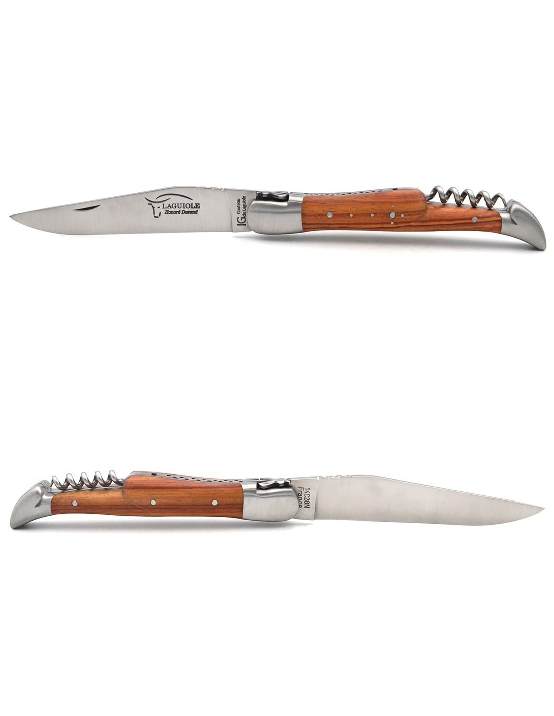Laguiole pliant 12 cm, lame & tire-bouchon, manche galbé en bois de rose avec 2 mitres en inox mat